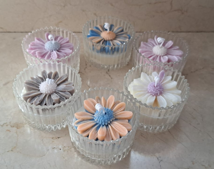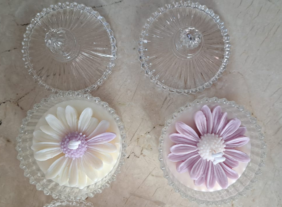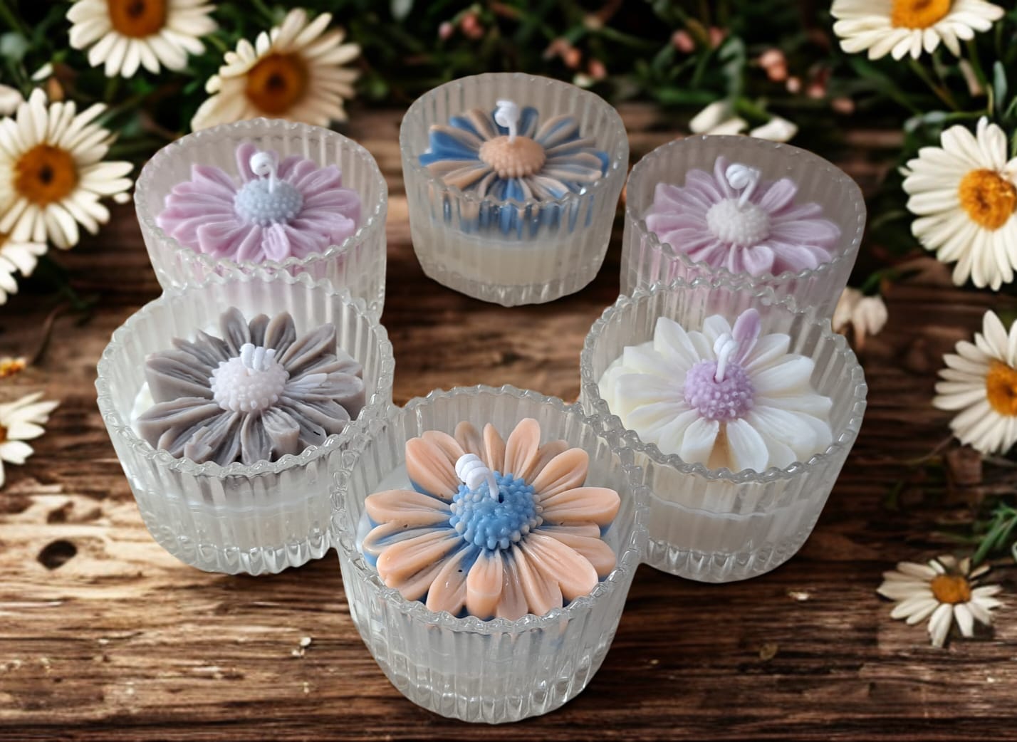 Realizadas a mano con cera de soja natural y decoradas con margaritas que aportan un toque natural y fresco aroma floral.
