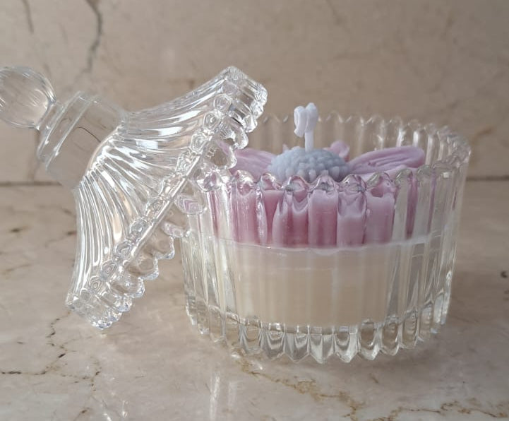 Disfruta de momentos únicos con esta elegante vela artesanal presentada en una preciosa bombonera de cristal decorada con delicadas margaritas. Perfecta para crear un ambiente acogedor y romántico en cualquier espacio de tu hogar.